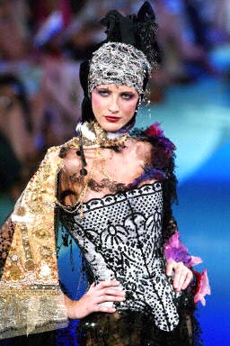 7月8日,法國巴黎2003-2004秋冬高級(jí)女裝展上模特展示設(shè)計(jì)師Christian Lacroix 的作品。