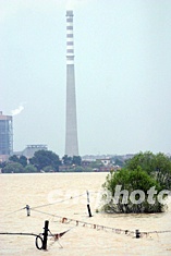 七月十一日,淮河水位上漲,淮河沿岸多處地區(qū)出現(xiàn)險情,如果出現(xiàn)潰堤,淮南的發(fā)電廠、煤礦等都將受到巨大損失。圖為即將沒頂?shù)碾娋桿與發(fā)電廠隔堤相望。中新社記者:盛佳鵬