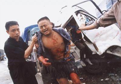 在現(xiàn)場(chǎng),聚集在受損最為嚴(yán)重的川M05049小貨車周圍的司機(jī)此刻也動(dòng)手救助卡在駕駛室里的同行。要救人就必須移開小貨車前面那輛大貨車,但它已經(jīng)無(wú)法發(fā)動(dòng),“我來(lái)試試!”排在第一的東風(fēng)大貨車司機(jī)從破裂的車窗翻進(jìn)駕駛室,汽車被發(fā)動(dòng)了!車輪在一厘米一厘米地前移,因猛烈撞擊已經(jīng)交錯(cuò)纏繞在一起的車體鋼板發(fā)出分離時(shí)的撕裂聲,川M05049已成麻花的駕駛室漸漸被移動(dòng)的前車扯高,當(dāng)最后一塊鋼板脫離時(shí),駕駛室轟然落下,被卡的3名傷者同時(shí)高聲喊疼。7時(shí)42分大家奮力拉開變形車門,將馬偉和劉德志抱出了險(xiǎn)境。重傷者記者鼓勵(lì)堅(jiān)持下去
