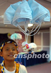 日前,香港舉行由港、臺(tái)兩地藝術(shù)家、民間人士以及小學(xué)生制作的以抗煞SARS時(shí)期口罩為題材的藝術(shù)作品展,圖為口罩制作的“降落傘”。中新社記者:錢興強(qiáng)