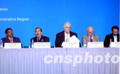 2003年7月14日在香港舉行的“重振亞洲旅游業(yè)會議”全體大會上,[左起]瓦努阿圖旅游部長Jean Alain Mahe、孟加拉國國民用航空和旅游部長Mir Mohammad Nasir Uddin、加拿大旅游委員會副總裁Thomas Penney、世界旅游旅行委員會主席鮑姆加騰、伊朗駐華大使Fereydoun Verdinejad等嘉賓出席會議并發(fā)表專題演講。中新社記者:洪少葵