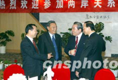 來自臺(tái)灣、香港、澳門以及海外和中國大陸的百余位專家學(xué)者十六日抵達(dá)麗江,出席十七日即將舉行的2003年海峽兩岸關(guān)系論壇。圖為國務(wù)院臺(tái)辦副主任王在希、海研中心主任唐樹備、云南省副省長邵琪偉與來自臺(tái)灣的郭俊次先生一起交談。中新社記者:毛建軍