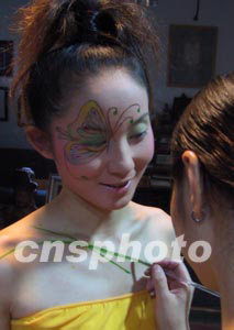 一名愛美的福州女子十八日欣然接受職業(yè)化妝師的彩繪裝扮。人體彩繪在福州成為一種時尚。作者:劉可耕