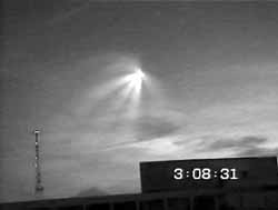 不過,不管怎么說,俄軍方要求天文愛好者把拍到的錄像給他們看看,結(jié)果斷定確實(shí)是二級(jí)火箭分離時(shí)的情景。至此,在全世界都鬧得沸沸揚(yáng)揚(yáng)的鄂木斯克城UFO之謎真像大白。圖為當(dāng)時(shí)拍的奇異情景(徐冰川/聞新芳)