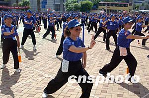 香港巨星劉德華,七月十九日冒酷署出席在香港舉行的“諾基亞6108揮筆舞劍創(chuàng)記錄”慈善活動(dòng)。 中新社記者:錢興強(qiáng)  香港五百人頭頂烈日揮寫書法及耍太極劍。中新社記者:錢興強(qiáng)