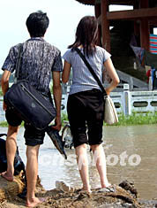 七月中旬在安徽省穎上縣八里河鄉(xiāng)的一個周末, 放假的學生們急切地返回淮河邊的家園。雖然養(yǎng)育他們的家已被洪水圍困,但是,學子們依然涉向滔滔洪水,去看望父老鄉(xiāng)親。圖為一對情侶大學生眺望家鄉(xiāng),準備走下防洪堤。中新社記者:賈國榮