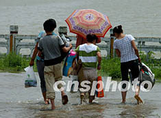 七月中旬在安徽省穎上縣八里河鄉(xiāng)的一個周末, 放假的學生們急切地返回淮河邊的家園。雖然養(yǎng)育他們的家已被洪水圍困,但是,學子們依然涉向滔滔洪水,去看望父老鄉(xiāng)親。圖為一群中學生相約走在洪水里的回家途中。中新社記者:賈國榮