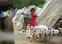 七月中旬在安徽省穎上縣八里河鄉(xiāng)的一個周末, 放假的學生們急切地返回淮河邊的家園,雖然養(yǎng)育他們的家已被洪水圍困。圖為一名小學生在淮河大堤上推車回家,她的家是眾多臨時避災棚中的一間。中新社記者:賈國榮