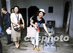 長(zhǎng)江三峽蓄水后吸引了許多人的關(guān)注。七月中旬,一百多位臺(tái)灣游客來(lái)到夔門(mén)參觀游覽。圖為臺(tái)胞在白帝城東碑林撫摸觀音像,從頭摸到手表示家里樣樣有。作者:李中全