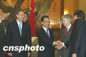 溫家寶說,他高興地看到近年來,中英關(guān)系不斷得到鞏固和發(fā)展,他愿以布萊爾此次訪問為起點(diǎn),與其攜手共同拓展雙邊關(guān)系,使中英關(guān)系取得更快、更大的發(fā)展。
