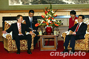 中國(guó)國(guó)家主席胡錦濤二十一日在北京會(huì)見英國(guó)首相布萊爾。中新社記者:滿會(huì)喬