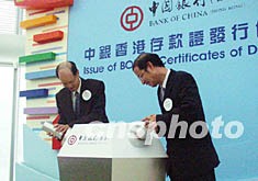 中國銀行(香港)21日在香港宣布推出四組港元及美元存款證,其中票面年息率最高為百分之三點(diǎn)四五。圖為該行副總裁林炎南(左)主持發(fā)行儀式。作者:裘之越