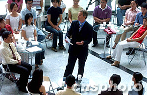 記者在現(xiàn)場看到,清華大學(xué)舜德樓一層大廳已經(jīng)擺上了二十張左右的圓形玻璃桌,近百位清華學(xué)子與十位清華老師圍圓桌而座。大廳的中間空出了一塊地方,預(yù)計布萊爾首相將坐在那里,與清華學(xué)子展開近距離接觸。