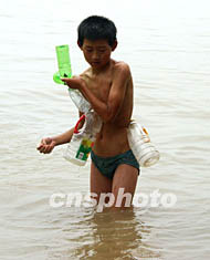 一名小男孩在淮河洪水中身綁自制的塑料飲料瓶救生衣,他家位于安徽省南市郊,七月被洪水圍困在堤上。中新社記者:賈國榮