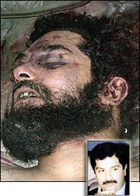 而烏代的遺容可謂慘不忍睹:眼臉因為淤血而顯得浮腫并呈絳紫色,一條深褐色的傷口從其左眼一直貫穿到嘴巴右下角,光禿禿的腦門上傷痕累累,可能是被導彈的碎片劃傷的。最為顯然的是其前額右上方一個汩汩地向外噴涌著鮮血的彈孔,他究竟是被美軍開槍打中的,還是自殺身亡依然是個謎。