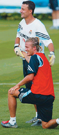 在隨后11打11的大對抗中,小貝仍然被分在替補一組,表現(xiàn)平平。在后衛(wèi)的緊逼之下,小貝在曼聯(lián)時那種姿態(tài)優(yōu)雅的傳中根本看不到。而在一次回防時,小貝竟將齊達內(nèi)的傳球鏟進了自家大門。這個烏龍球也成了小貝在昨天訓練中唯一的收獲。