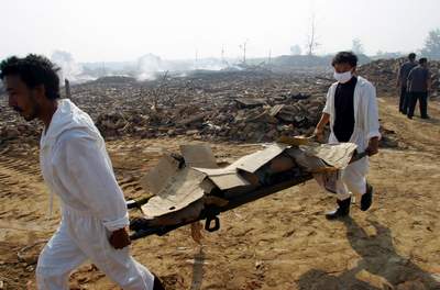 圖:醫(yī)務工作者搶運辛集爆炸煙花廠遇難者