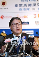 香港足球總會會長霍震霆7月30日主持記者會,公布足球勁旅皇家馬德里8月8日對香港足球隊的比賽詳情。作者:洪少葵
