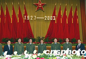 中國國防部三十一日在北京舉行招待會,慶祝中國人民解放軍建軍七十六周年。中央軍委副主席曹剛川(中)、中央軍委委員廖錫龍(左二)、徐才厚(左三)、梁光烈(右三)、李繼耐(右二)出席招待會。中新社記者:鄭萍萍