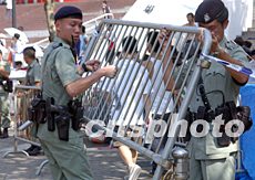 七月三十一日香港出售“皇馬”球賽門票,由于購買球票的球迷眾多,警察在香港大球場加強治安警戒。中新社記者:錢興強
