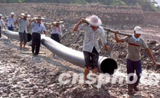 浙江玉環(huán)縣的淡水資源本來就十分緊缺,持續(xù)一個多月的旱情更是火上澆油,使該縣60%的人口(約30萬人)飲用水發(fā)生困難。為此,玉環(huán)縣緊急撥出1450萬元,鋪設(shè)17公里長的跨海穿河管道,實施北水南調(diào)。8月1日,施工人員冒著酷暑在灘涂下埋設(shè)水管,爭取早日完工。作者:鐘袁