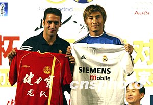 西班牙皇家馬德里足球隊(duì)與中國健力寶龍隊(duì)八月一日在北京飯店舉行賽前新聞發(fā)布會(huì),皇馬隊(duì)長勞爾與龍隊(duì)隊(duì)長李瑋峰在會(huì)上互贈(zèng)隊(duì)服。中新社記者:毛建軍
