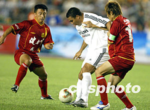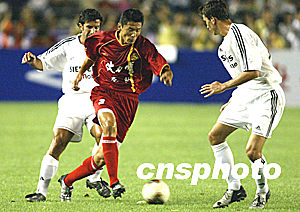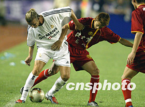 在北京工人體育場上萬球迷的歡呼聲中,勞爾、菲戈、齊達(dá)內(nèi)、貝克漢姆、羅納爾多、卡洛斯六大巨星首發(fā)出場。憑借出色的個人能力和簡練、精妙的配合,皇馬向中國球迷展示了他們與身價相當(dāng)?shù)膶嵙Α6堉犚矝]有讓中國球迷失望,拼搶積極、攻防到位,制造了多次有威脅的進(jìn)攻。