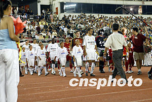 西班牙皇家馬德里足球隊(duì)與中國(guó)健力寶龍隊(duì)的比賽八月二日晚在北京工人體育場(chǎng)舉行。中新社記者:毛建軍