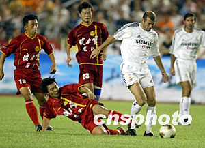 西班牙皇家馬德里足球隊(duì)與中國(guó)健力寶龍隊(duì)的比賽八月二日晚在北京工人體育場(chǎng)舉行。圖為龍隊(duì)隊(duì)員飛身鏟斷齊達(dá)內(nèi)的帶球進(jìn)攻。中新社記者:毛建軍