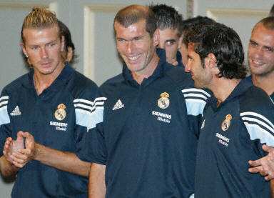當(dāng)?shù)貢r(shí)間8月4日上午,日本方面為皇馬舉行了隆重的歡迎儀式,圖為貝克漢姆和齊達(dá)內(nèi)等在發(fā)布會上。