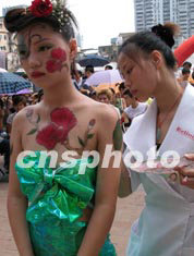 七日,在廣州上下九商業(yè)步行街廣場上,一場精彩的人體彩繪吸引眾多市民駐足觀看。在廣州,人體彩繪已成為商業(yè)推廣中的一項主要活動。作者:劉衛(wèi)勇