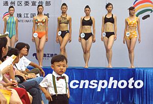 百余名泳裝佳麗競相登場。一名觀眾席上的小帥哥躍躍欲試當眾擺出瀟灑姿勢。中新社記者:廖文靜