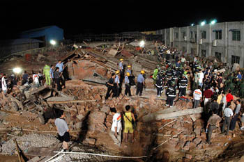 市公安局指揮中心的應(yīng)急救助車的探照燈把廠房坍塌的事故現(xiàn)場照得一片通明。搶救工作正在緊張地進行。