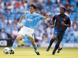 這是曼城備戰(zhàn)新賽季英超的最后一場比賽,同時(shí)也是曼徹斯特大球場的揭幕戰(zhàn),因此,主教練基岡格外重視。孫繼海首發(fā)出場擔(dān)任右后衛(wèi),他的身后是門將西曼。而他面對的是剛剛轉(zhuǎn)會(huì)巴塞羅那隊(duì)的小羅納爾多的進(jìn)攻。第5分鐘,奧維馬斯帶球突破菲利普斯后獲得很好的機(jī)會(huì),孫繼海上前封堵,逼得奧維馬斯傳球出界。雖然對手實(shí)力很強(qiáng),但在主場作戰(zhàn)的曼城仍與對手展開對攻。孫繼海與菲利普斯這邊的進(jìn)攻明顯要比左路活躍。第34分鐘曼城首先打破僵局,貝爾科維奇中路得球后轉(zhuǎn)身快速突破,雷茨格爾慌亂中將球誤傳給阿內(nèi)爾卡,法國人門前右腳推射破門。上半場曼城一球領(lǐng)先巴塞羅那。