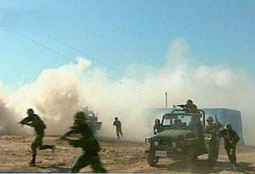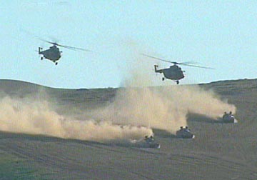 在攻打恐怖分子營(yíng)地、圍殲恐怖分子的實(shí)兵實(shí)彈演習(xí)中,參演的聯(lián)合部隊(duì)800多人對(duì)邊境地區(qū)的恐怖分子營(yíng)地展開了強(qiáng)大的攻勢(shì)?罩兄鄙龣C(jī)盤旋攻擊,地面坦克、裝甲車和步兵從左、中、右三路對(duì)恐怖分子實(shí)施圍剿,遠(yuǎn)方炮兵強(qiáng)大的火力摧毀恐怖分子營(yíng)地內(nèi)的堡壘,壓制著恐怖分子的火力,不時(shí)有導(dǎo)彈呼嘯而過(guò),準(zhǔn)確地?fù)糁锌植婪肿拥闹笓]地點(diǎn)。特種反恐分隊(duì)在模擬國(guó)境線上空降,截?cái)嗫植婪肿拥脑骄程右葜贰?/p>