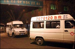 現(xiàn)場(chǎng)到處是救護(hù)車、警車、醫(yī)生、救護(hù)隊(duì)員。由于是國有大礦,一切救護(hù)工作都顯得井然有序。井口在一個(gè)不大的四方小院里,井口邊緣掛著燈,再往里看時(shí),感覺到黑壓壓的很深。井口正對(duì)面的宣傳欄上,寫著“警鐘常鳴”,“實(shí)施安全生產(chǎn)法”等字樣。三礦醫(yī)院的副院長穿著白大褂,帶著20幾個(gè)醫(yī)護(hù)人員守侯在井口,據(jù)說井下還有4、5個(gè)醫(yī)護(hù)人員。據(jù)悉,到晚上22時(shí),已經(jīng)有4批救護(hù)隊(duì)員下井勘察。