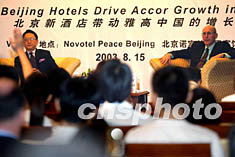法國雅高亞太區(qū)董事行政總經(jīng)理艾森柏(右)十五日在北京宣布,包括中國首家國際經(jīng)濟性酒店天津宜必思在內(nèi)的九家酒店即將在中國開業(yè)。他表示“非典”并沒有降低中國未來發(fā)展?jié)摿,這是拓展中國酒店網(wǎng)絡(luò)最有利的時刻。中新社記者:鄭萍萍
