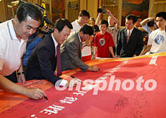 十五日,中國體育代表團出征世界大學生運動會贊助儀式在北京舉行,美國耐克公司成為中國大運代表團歷史上第一個國際贊助商。圖為在捐贈儀式上,各方代表在中國大運健兒的“心愿旗”上簽下祝福。中新社記者:趙振清