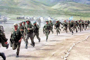 8月6日上午10時(shí)10分,哈薩克斯坦東部地區(qū)的哈、中、吉、俄、塔5國(guó)“聯(lián)合—2003”反恐演習(xí)在某軍用機(jī)場(chǎng)跑道上正式舉行。鮮艷的五星紅旗在多邊聯(lián)合軍事演習(xí)場(chǎng)首次升起。