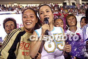 直到比賽開始后5分鐘,先農(nóng)壇體育場外仍有大量等著要票的球迷,這一切源于人們對女足的關愛。開球前,載著38位南北女俠的38輛摩托車緩緩駛?cè)肭驁觯谂c著名歌星田震共同高歌《風雨彩虹·鏗鏘玫瑰》這首女足之歌后,隊員們手捧著鮮花擁向前來為她們助威的“抗非典”女英雄們。女足姑娘們的精彩表演給了現(xiàn)場球迷至高享受,同時也為她們自己贏來了巨額的獎金,獲勝的北方隊得獎10萬元,而南方隊也有5萬元之多的安慰。兩隊的進球功臣白潔、韓端因為優(yōu)異的表現(xiàn)開走了兩輛獎品摩托車。