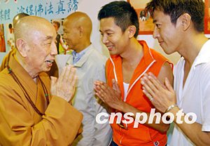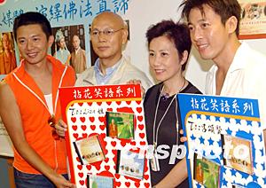 由星加坡福海禪院與好合拍多媒體集團(tuán)合作出版的《拈花笑語系列》光盤發(fā)布會(huì)八月十八日在香港舉行,圖為明義法師(左)與香港藝員何寶生(中)、呂頌賢(右)在新聞發(fā)布會(huì)上。中新社記者:錢興強(qiáng)