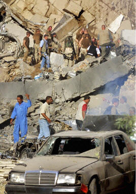 聯(lián)合國雇員告訴?怂剐侣,爆炸發(fā)生時大樓里至少還有150名工作人員。?怂剐侣動浾叩-斯普林杰自現(xiàn)場發(fā)回的報道稱,兩層高的“運河賓館”有整整一個角被炸掉!據(jù)稱,爆炸的中心位置好象位于賓館的大廳。(章田)