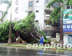 今年第十二號(hào)臺(tái)風(fēng)“科羅旺”二十五日凌晨在海南省文昌市翁田鎮(zhèn)登陸,登陸時(shí)臺(tái)風(fēng)中心風(fēng)力達(dá)十二級(jí)。?谑泻8芬恍┐箝艠(shù)被刮倒。作者:莫成雄