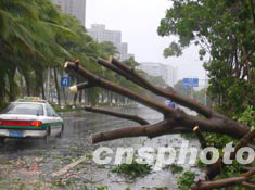 第十二號(hào)臺(tái)風(fēng)“科羅旺”八月二十五日凌晨橫掃海南?谑袇^(qū),?谑袃(nèi)大批樹(shù)木被刮倒。當(dāng)日上午許多被吹倒的樹(shù)木迅速被市政工人砍斷枝叉,以免影響交通。作者:蔣聚榮