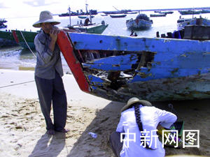 中新社?诎嗽露针(記者關(guān)向東王辛莉通訊員余茂生)?谛潞4鍧O民陳家位,一臉疲憊地依在剛打撈出水的自家漁船船頭,船頭左側(cè)一大洞,后艙甲板翻倒在沙灘上,兩年前花七萬元人民幣造的漁船因一場(chǎng)臺(tái)風(fēng)轉(zhuǎn)眼間散架成一堆廢木。