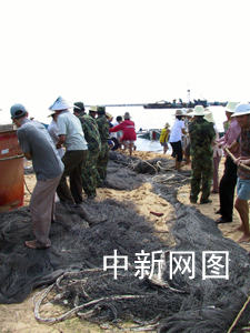 記者在現(xiàn)場(chǎng)看到:海南省海事局派出打撈船在緊張作業(yè),來自駐地的海軍潛水員忙著幫漁民將纜繩系上水底的漁船,而秀英區(qū)武裝部的戰(zhàn)士與當(dāng)?shù)氐母刹俊⒋迕褚坏览|,將剛剛出水的船只拖上岸。