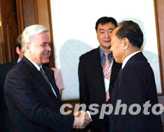 李肇星外長(zhǎng)與韓、日、朝、俄、美代表團(tuán)團(tuán)長(zhǎng)及大使等一一握手、寒暄,大家很配合地?cái)[出好的角度,讓少數(shù)獲得特許進(jìn)來采訪的記者們拍照。