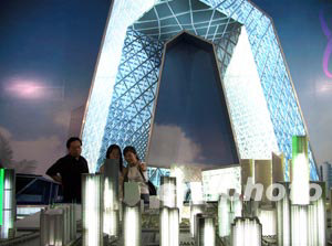 一進展廳,只見趙忠祥、李瑞英、羅京笑瞇瞇地坐在臺前,馬上把觀眾帶入《新聞聯(lián)播》的氛圍中。這是第一個展區(qū):走近央視,包括央視臺標簡介、十三個頻道簡介及屏幕的實時播出畫面、大型電視墻等,著名主持人、記者和編導也將在此與觀眾面對面交流。另有互動平臺、經(jīng)典薈萃、走向世界、數(shù)字浪潮、未來時空等一共十個展區(qū),回顧了中國中央電視臺四十五年發(fā)展史,并展示了新臺址工程。