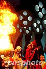 今秋在北京北展劇場舉行的中國電影華表獎頒獎晚會上,京劇名家現(xiàn)場表演噴火絕活,為晚會助興。中新社記者:武仲林