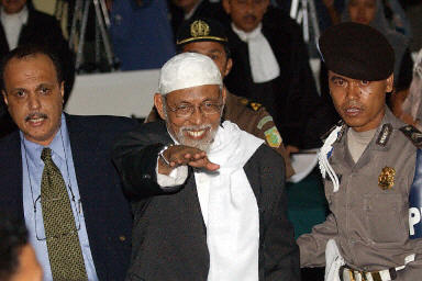 印尼一家法庭9月2日裁定被疑與“基地”組織有牽連的東南亞激進(jìn)組織“伊斯蘭祈禱團(tuán)”的精神領(lǐng)袖阿布·巴卡爾·巴希爾(中)參與了叛國行動,并判處他4年監(jiān)禁。巴希爾不服這個判決結(jié)果,表示將上訴。